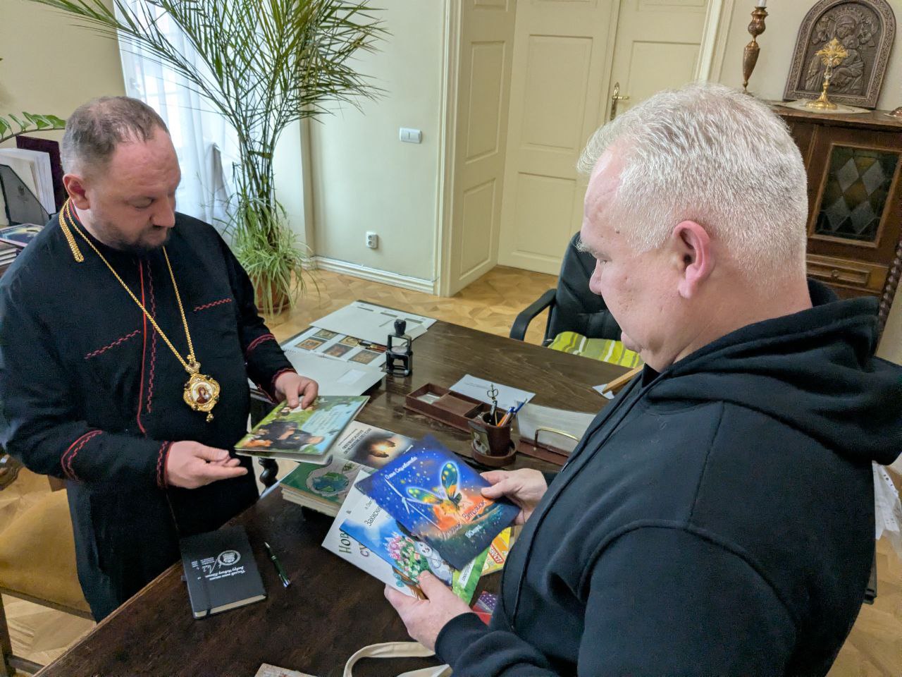 Владика Теодор ознайомився з виданнями Екобюро УГКЦ, включно з українськими перекладами енцикліки Laudato Si’ та апостольського повчання Laudate Deum, а також із сучасними екосоціальними ініціативами — екологічними місіями та проєктом «Сади Надії». Єпископ висловив зацікавлення душпастирським виміром екологічного служіння та підтвердив готовність до розвитку спільних проєктів.