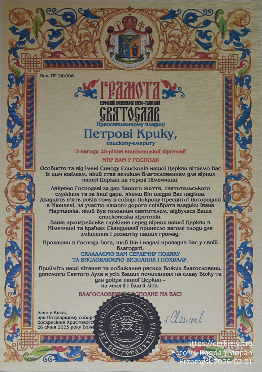 3 лютого єпископ-емерит владика Петро Крик святкує 25 років від дня єпископської хіротонії. З цієї нагоди Отець і Глава УГКЦ Блаженніший Святослав привітав ювіляра особисто і від імені Синоду Єпископів УГКЦ.