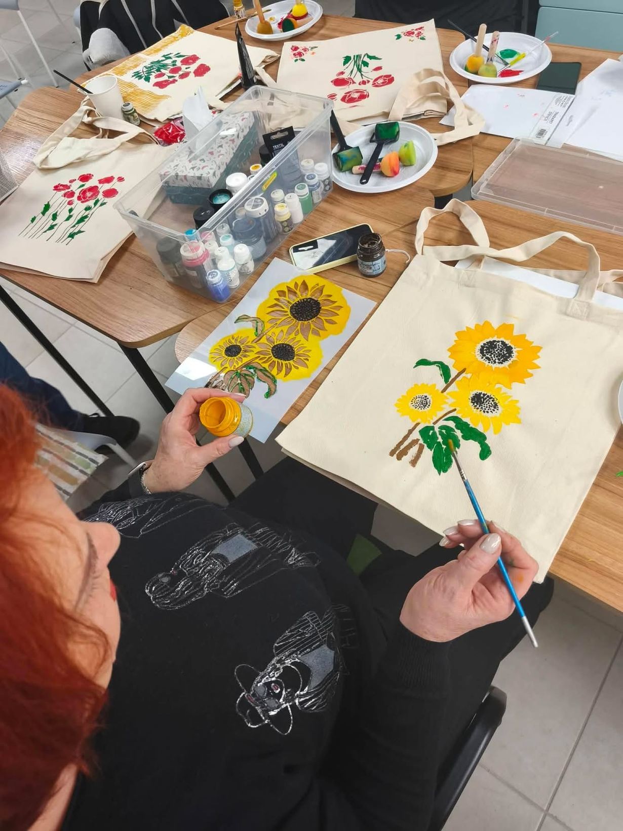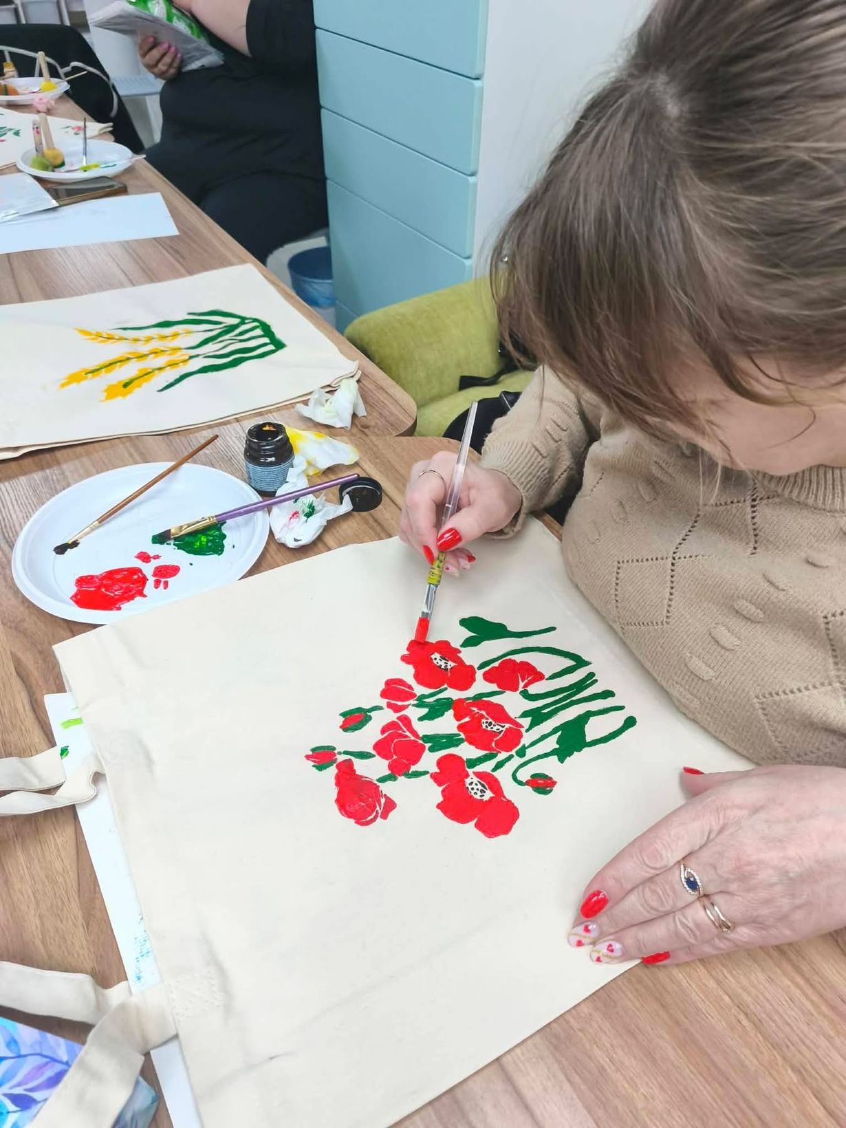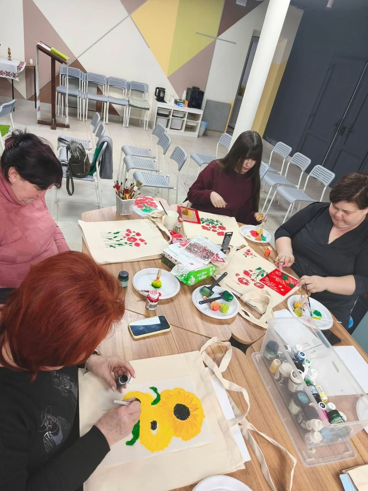 Далі відбулася творча частина зустрічі — разом із майстринями Оленою Ящук та Іриною Юрченко учасниці виготовляли аксесуари — шопери та чохли для окулярів.