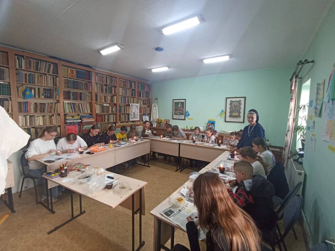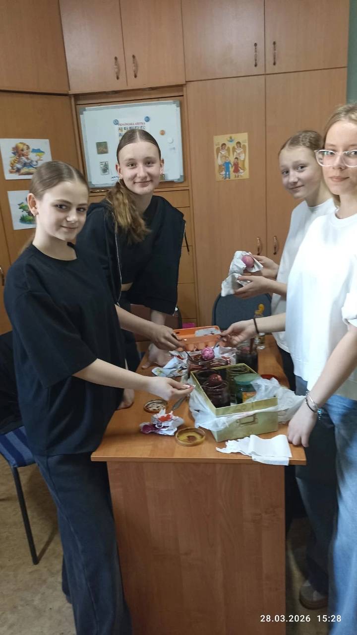 Після молитви заняття продовжувалися в недільній школі. Діти читали біблійні історії, роздумували над Божим словом, розмальовували малюнки, слухали короткі розповіді про писанки, дізнавалися, як їх розписувати і спробували це на практиці.